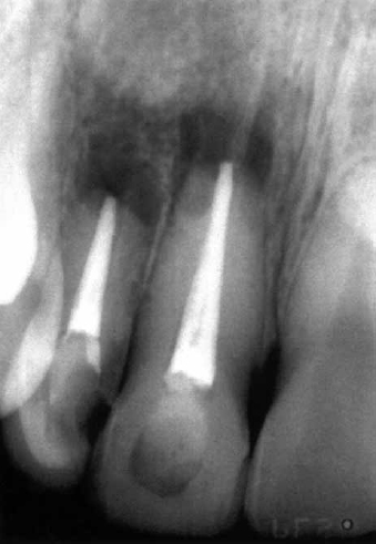 Fig 1. Periapical radiograph of upper right central and lateral incisors of case MK when periapical abscess developed 3 years after root filling. Bacteriologic sample was taken from root canal of upper central incisor during retreatment, which revealed presence of A radicidentis strain CCUG 42377.