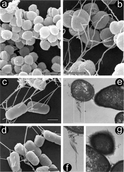 Fig 2. Scanning (a-d) and transmission electron micrographs (e-g) of A radicidentis, strain CCUG 36733. Cells grown on Brucella blood agar exhibit coccoid shape (a), similar to cells grown in serum-supplemented Tryptic soy broth, where fimbriae-like bundles can be seen (b). When cells were grown in RPMI-1640 broth with serum (c, d), they were rod-shaped with intertwining bundles of fimbriae-like cell appendices in a netlike arrangement. In thin section (e), bundle of fimbriae can be observed emerging from cell surface; demarcated area in (e) is magnified in (f). Further thin section (g) shows radially placed fimbriae emerging from fuzzy-coated cell surface. Bars = 1 µm.