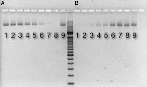 Figure 1. DNA binding to ceramic HA. An electrophoresis gel picture showing detectable DNA in supernatant after binding to increasing amounts of (A) HA and (B) after releasing DNA from HA by the addition of EDTA. Respective lanes contain the following mass of ceramic HA type II: (1) 0.8 mg, (2) 1.3 mg, (3) 1.8 mg, (4) 3.0 mg, (5) 3.5 mg, (6) 5.6 mg, (7) 7.4 mg, (8) 9.4 mg, and (9) control: H2O + DNA (318 ng).