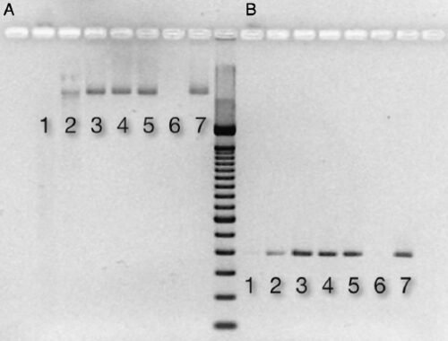 Figure 2. Nuclease activity after DNase incubation with ceramic HA. After incubation, nuclease activity in the supernatant was assessed by adding DNA for 30 minutes. The electrophoresis gel picture shows detectable DNA in (A) the nonamplified form and (B) after PCR amplification. Respective lanes contain the following mass of ceramic HA type II: (1) 1 mg, (2) 5 mg, (3) 10 mg, (4) 15 mg, (5) 20 mg, (6) control: DNase (0.5 U) + DNA (150 ng), and (7) control: DNA (150 ng) in water.