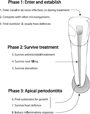 The properties necessary for microorganisms to persist in the root-filled canal are outlined in Fig. 2. Some of the physiological traits required for entry and initial establishment may be similar to that of microbes inhabiting a necrotic pulp in an untreated canal, such as an ability to find nutrients, compete with other microorganisms and evade initial host defenses.