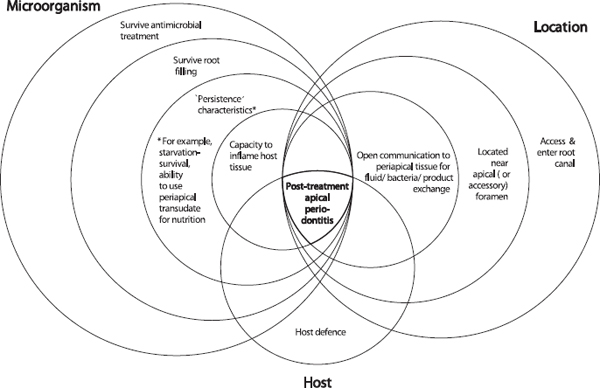 In a study that examined the influence of infection at the time of root filling on the outcome of treatment (41), 68% of teeth, which were infected at root filling, healed after the treatment. Similar results have also been reported in other studies (45, 205, 206). Whilst infection at the time of root canal filling will adversely affect the outcome of treatment, the presence of a persistent pathogen, alone, is not sufficient for persistence of disease. There must be a set of conditions that occur in combination to result in persistence of endodontic disease. These conditions are shown conceptually in Fig. 3. A set of microbial characteristics, coinciding with a set of location parameters permits an interaction with the host that will determine whether there will be persistent apical periodontitis.