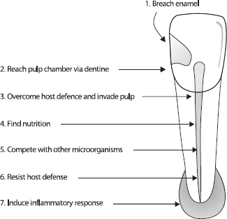 For bacteria to establish successfully as endodontic pathogens, they must overcome a series of consecutive barriers on and within the host tooth. It is likely that bacteria act in concert with others to penetrate hardand soft-tissue barriers, establish and then survive in the root canal.