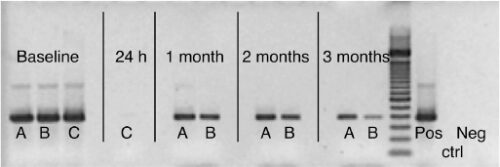 Figure 2. Recovery by PCR of F. nucleatum DNA after coculture in a bacterial consortium (P. micra, P. alactolyticusand P. intermedia in 50% sera) with and without dentin. Analysis by gel electrophoresis of amplified DNA product. Data collected at baseline; 24 hours; and 1, 2, and 3 months. A, Dentin-bound DNA incubated in bacterial mix; B, dentin-bound DNA incubated in bacterial mix with the addition of P. intermedia every other week; C, free (no dentin or collagen) DNA incubated in bacterial mix. Controls: positive amplification control (Pos) and negative control; DNA template was replaced with ultrapure water (Neg).